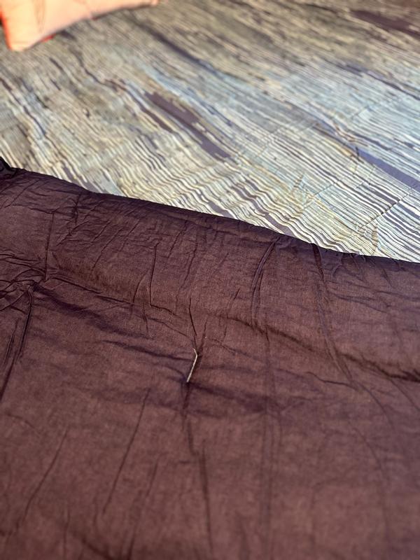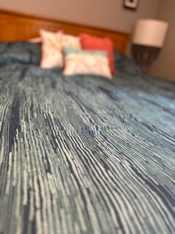 This comforter is beautiful!!! The colors are deep and easy to match. It definitely fits well on a queen size bed (with plenty of overhang!) It is much thicker than I thought, and front / back is 100% cotton which I prefer (with a 100% polyester filling). The back of the comforter is a dark navy, which did not photograph well. I’m using this in my guest bedroom and I’ve already received compliments on warmth, style, and color!