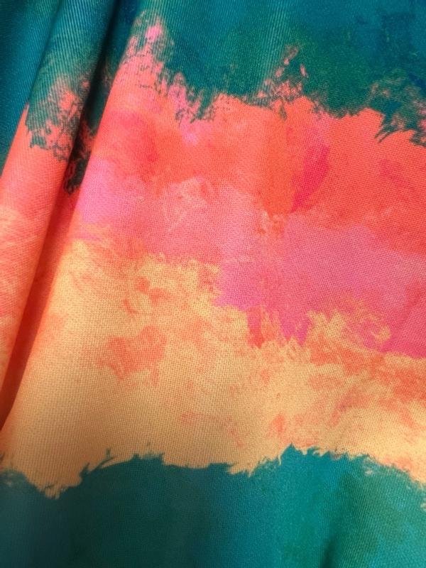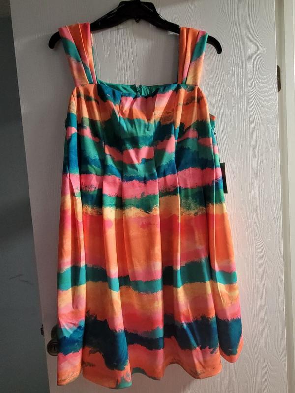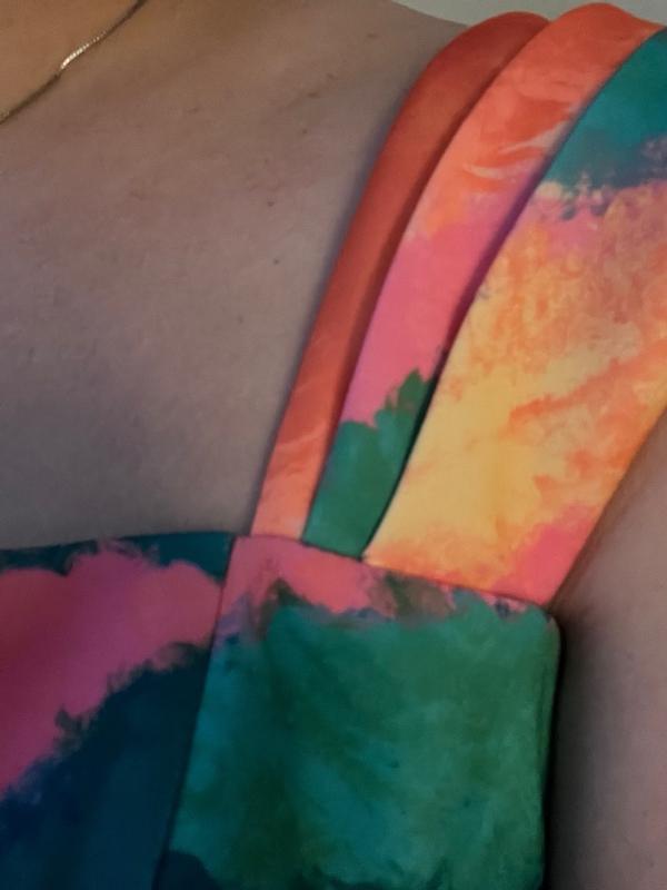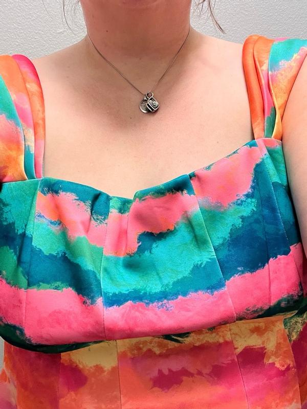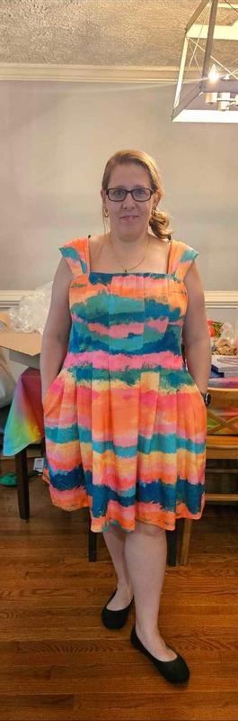 I got what would be my normal size in most stores for a dress, but probably could have gone one size smaller. The material is so comfortable, it has a great stretch, too. Zipper back for all chest sizes. The neckline is super flattering for my collarbones. The pleated shoulders and POCKETS may be my favorite design features. The brilliant water color pattern is so fun. This will be a great dress to wear in Spring and Summer.