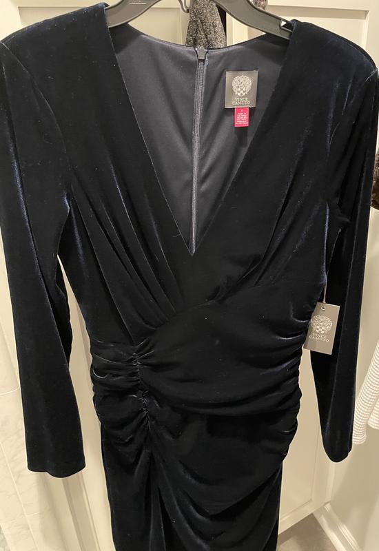 Vince Camuto navy blue velvet dress is really pretty. The navy color really stands out especially in the daytime. It’s a beautiful color. The quality of the dress is great. Fits good, maybe could have sized down but since the ruching hugged my waist it fit nicely. Can’t wait to wear it to a wedding!