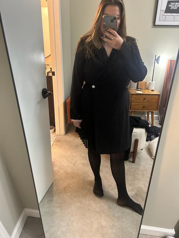 This dress looks really classy and perfect for business casual. The blazer-style top and little sparkle button make it polished but still cute. It does look a bit big on you, but the design itself is super elegant and easy to wear for work or nicer events.