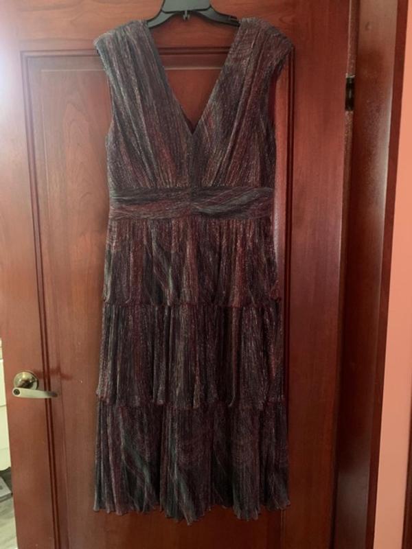 I really love this Vince Camuto Crinkle Metallic Knit Midi Dress. The metallic fabric has just the right amount of shimmer, and the crinkle texture gives it such pretty movement. The V-neckline and tiered skirt are flattering and feminine, and the size 4 fits comfortably without feeling tight. A couple of things to note, though: I’m petite, so the dress runs longer on me—more of a true midi/tea length than what’s shown. It’s still lovely, just something shorter folks might want to keep in mind. I’m also not a fan of the built-in shoulder pad; I wish the shoulders had a softer, more natural feel. Overall, despite those details, it’s a gorgeous, easy-to-wear dress that feels special and would be perfect for holidays, weddings, or any event where you want something polished with a bit of sparkle.