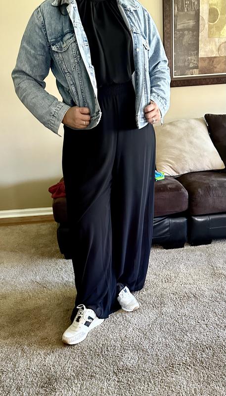 Purchased this on sale and in black. It's really beautiful and very classy. The pants are very long and even though I purchased the smallest size, they'll need to be shortened. The elastic waistband is also a tad loose even in the small size.