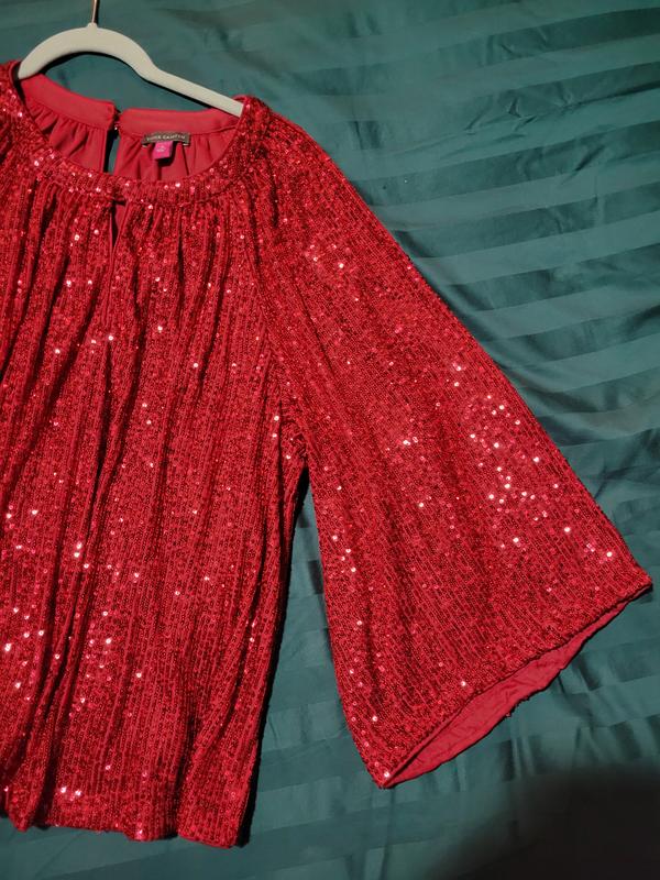 Just received this top. Haven’t worn it yet. It fits true to size and is lined. There are some loose threads on sleeve, so need to be careful since sequins can come off. Got it at a very reduced price so will probably keep it for a special occasion. The foxtrot color is gorgeous.