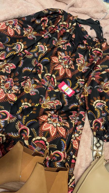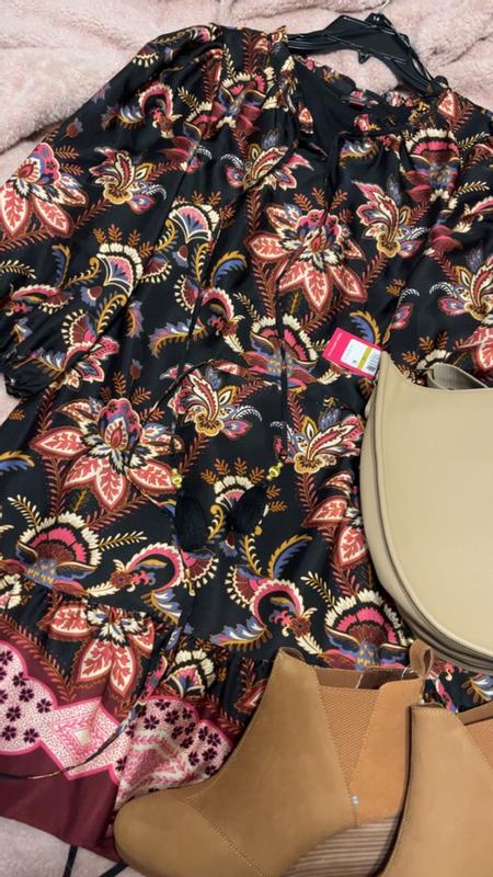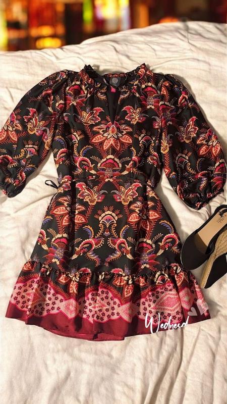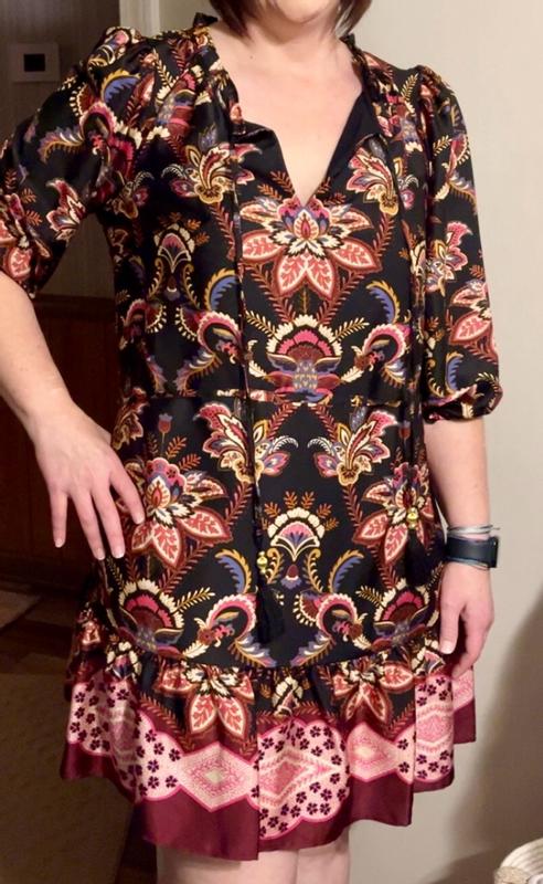 I was excited to be chosen to try this Vince Camuto fit and flare dress. I usually wear leggings with my dresses, and this one would go with or without. The print was very pretty and great for fall. The fit and flare is not great for us with pear shapes, so it didn’t really flatter my figure. The material was silky, but had absolutely no give whatsoever. Great dress for the thinner gals or if you have anything besides a pear shape. I got my regular size 14 and it fit up top but was too snug for my comfort on the bottom half. Vince Camuto is a great brand and I will continue to purchase, just not this dress.