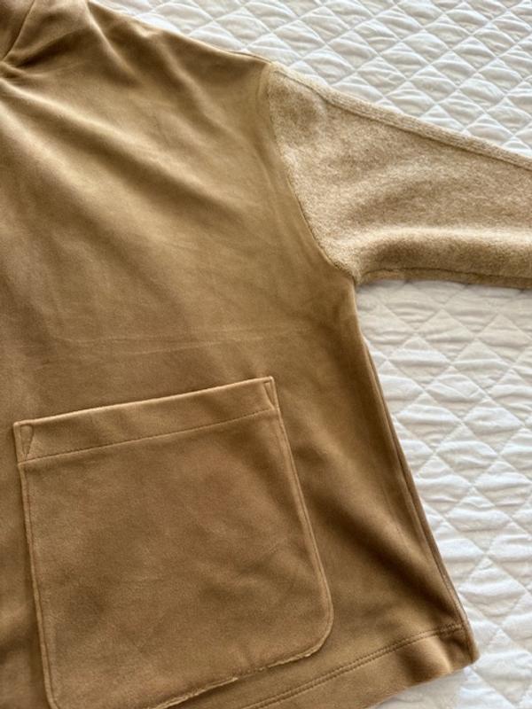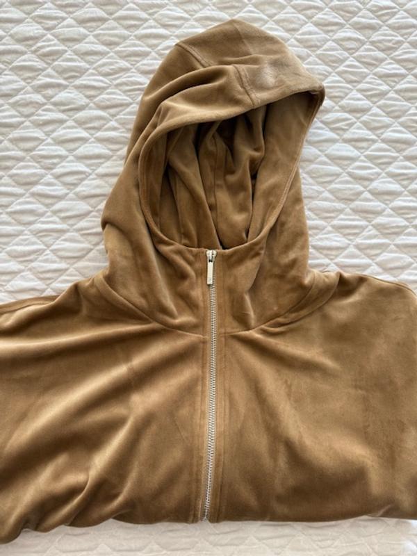 What a beautiful soft hoodie! I truly love it I got lots of compliments while wearing it! The color is a perfect camel color! It’s so stylish! The size runs a little big I got a small and it’s very roomy. The style is a more swingy style not fitted! The knit on the sleeves and velvet all over is so different and trendy! It’s a very comfortable material too!