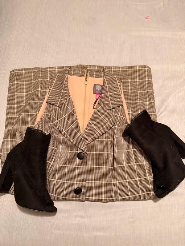 This Vince Camuto blazer dress is the perfect dress for most occasions. Whether for your work place or dinner, it wears fine. It’s really classy and gives an old school vibe. It’s true to size. The fabric consist of 64% polyester, 34% rayon and 2% spandex. It has little stretch but It hugs your curves really nice. The buttons are fake so you cannot unbutton it from the front. It uses a zipper on the back and the pockets, (like the buttons), are for show only. Overall it’s a lovely dress for any occasion.