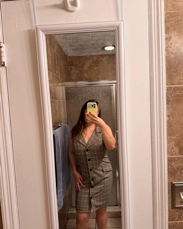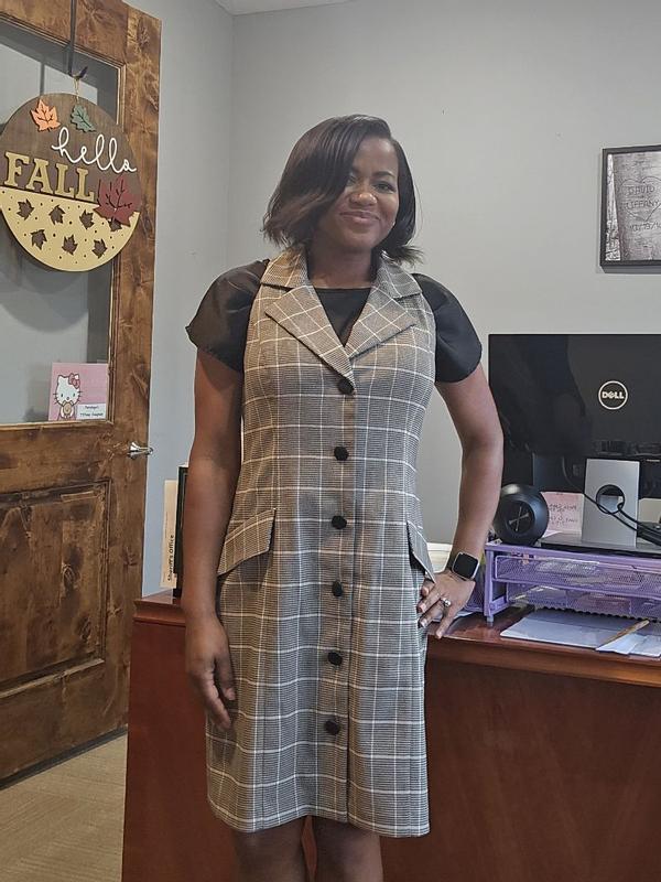 This halter dress is so cute, yet comfy. I'm wearing a size 6 but could fit a size 4 better. I love the button details and tailored look. I receive many compliments at the office.