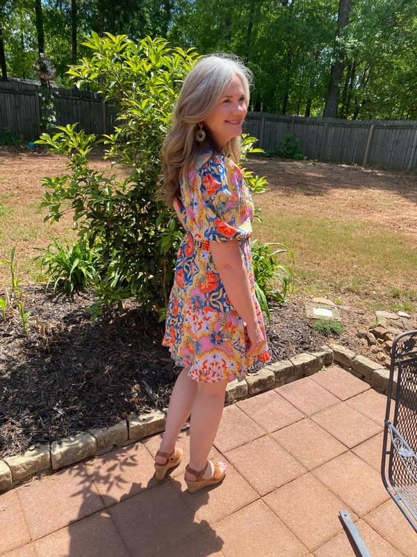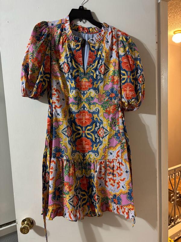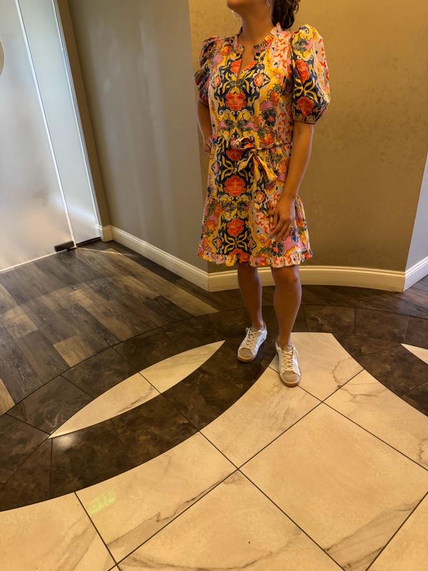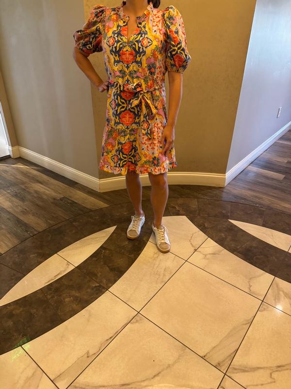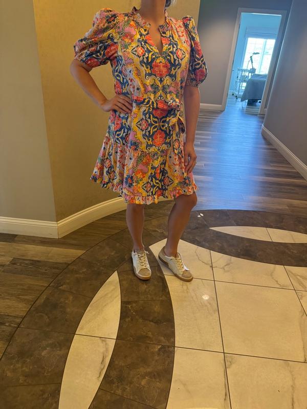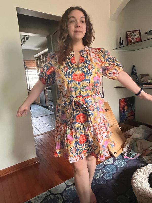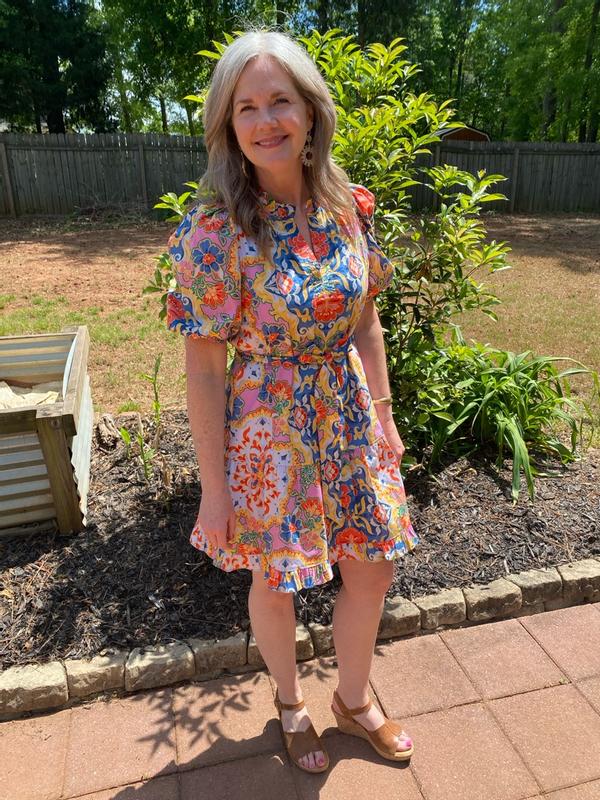 This Vince Camuto dress is such great quality! It is fully lined, well-made, and easily cared for. The print is vibrant and eye-catching without being overwhelming, and the cotton fabric feels breathable and light—perfect for warmer days. The fit is true to size, maybe even a touch generous. I typically wear a size 8 but ordered a 6, and it fits great. The tie waist helps create a flattering silhouette, and the ruffle neck adds just the right amount of feminine detail. I’m impressed by the added structure in the neckline to keep the ruffles lying flat. The puff sleeves and tiered skirt give it a stylish, on-trend look, but it’s also timeless enough to wear for years to come.
