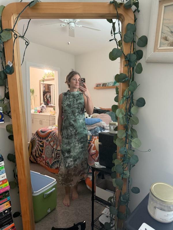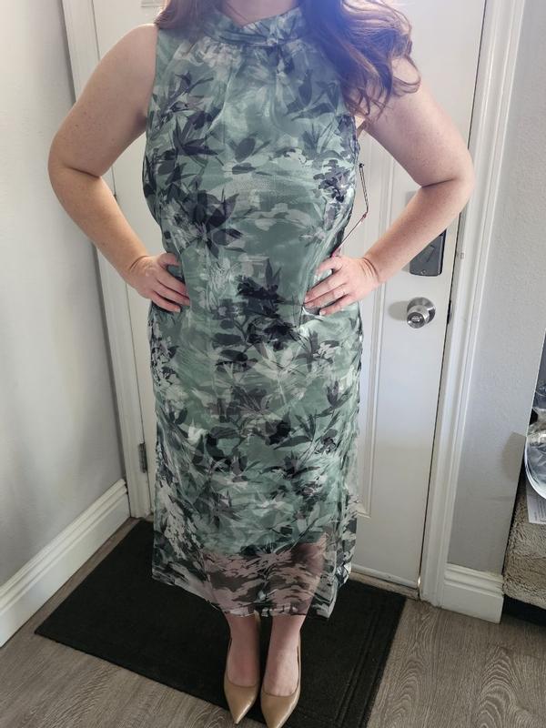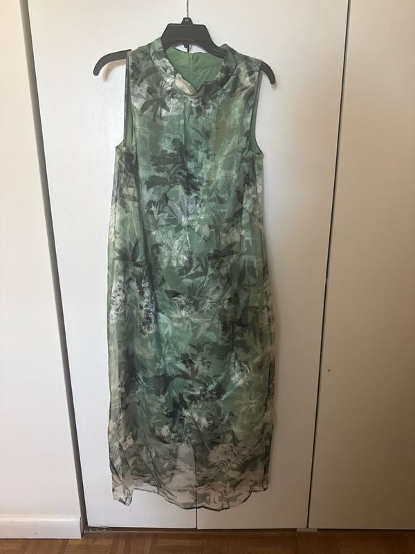 Column dresses are not typically flattering on me. I have a smaller waist but 34DD bust and hips to match (5'5" tall). My go-tos are dresses that are form fitting since without, I tend to look like a frumpy sack. This dress is a little more "body skimming" than I prefer but the cut was actually quite nice and (despite the potato picture) is more flattering than I thought it would be. The underlayer has no give, goes to the knee, and is printed with the same Asian botanical print as the organza overlay. The overlay has a sheen and I actually really like that it goes mid-calf. The chest is cut nicely and the arm holes are appropriately sized. The neckline is wider than I like (a closer fit mock neck would have been better here). The zip up the back was smooth.