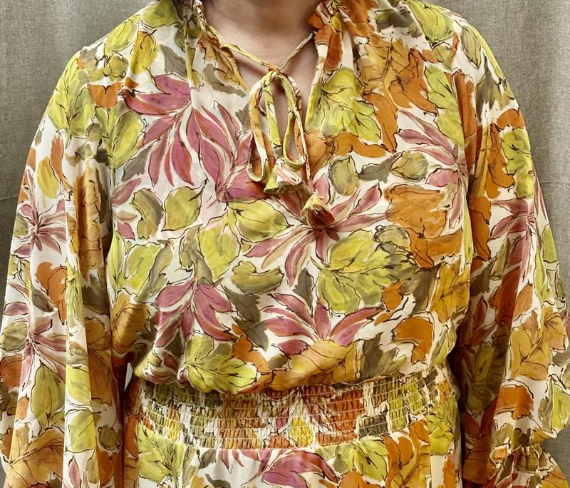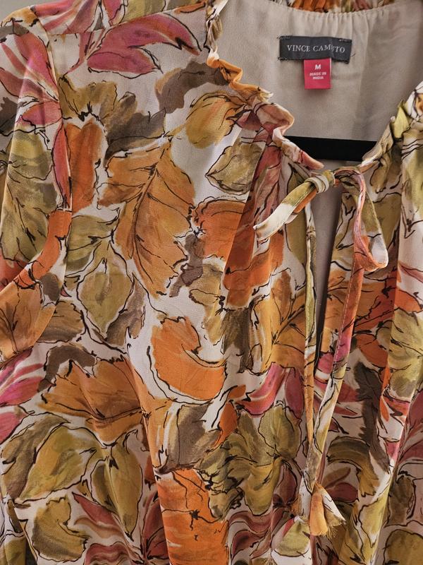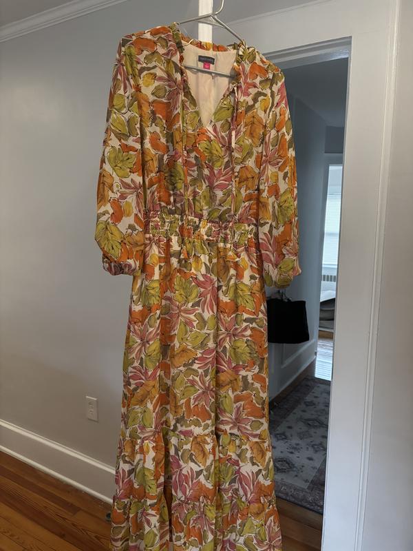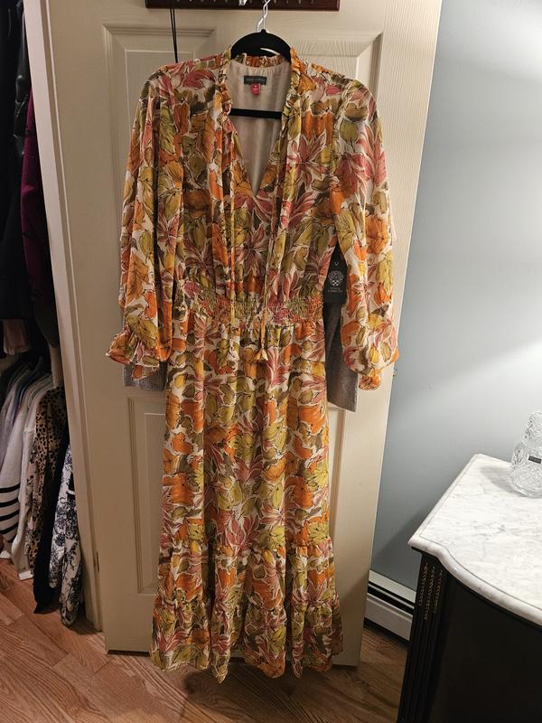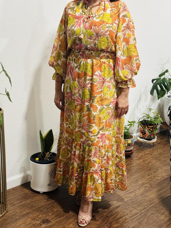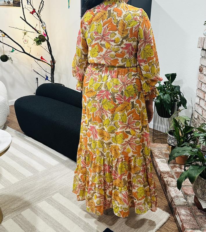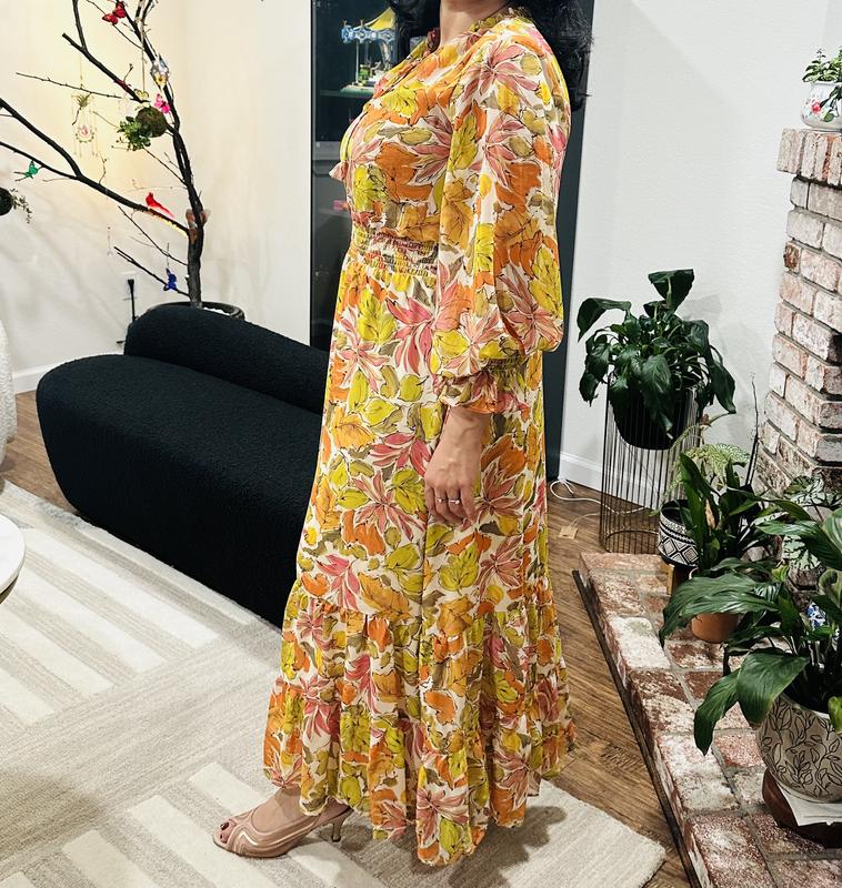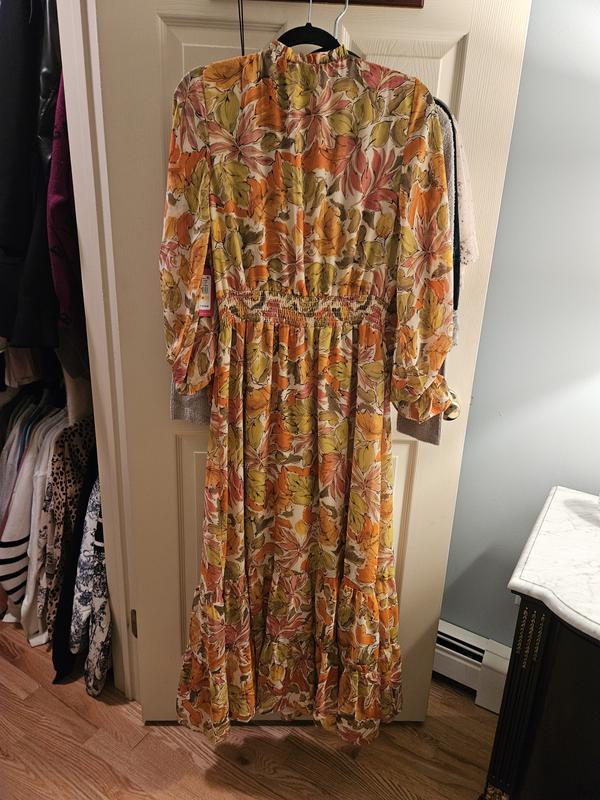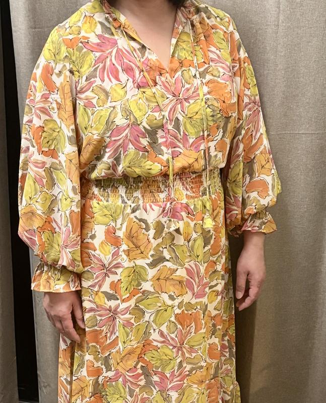 Love this dress. I had it in my favorites for so long. Color and print is beautiful. Material is soft and dress sits on you nicely. Love the long sleeves. It can be worn in spring or fall with all those beautiful fall colors in it.