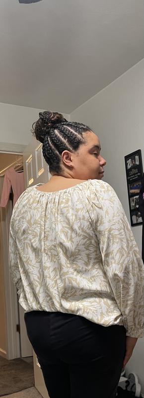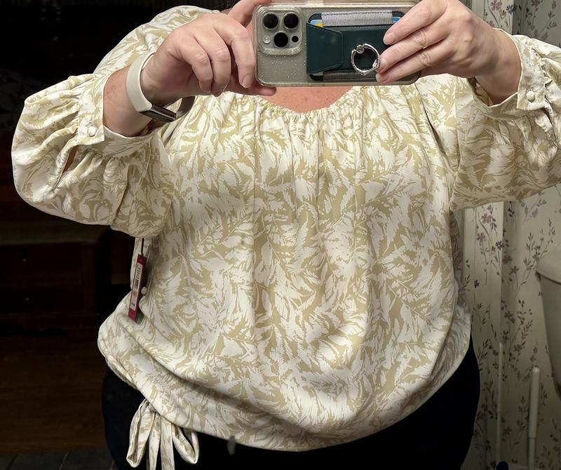 Beautiful blouse in bright, vibrant colors. This off the shoulder style actually stays put rather than slips.
