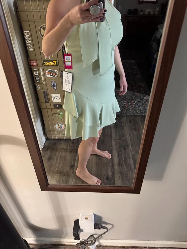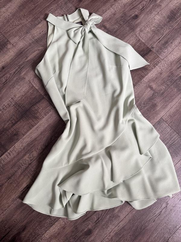This sleeveless sage-green mini dress feels special and it’s suitable for a daytime event as well as for an evening out. The halter neckline ties into a pretty bow at the shoulder, adding a romantic detail. It’s made from a lightweight fabric, it drapes beautifully over the body and finishes with a gently ruffled asymmetrical hem. Sadly it’s all polyester but at the same time it doesn’t crease that means you can pack it with you when traveling and you won’t have to iron it.
