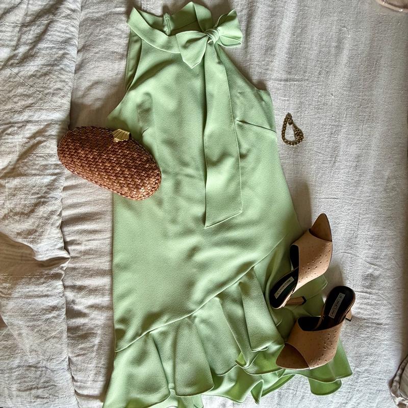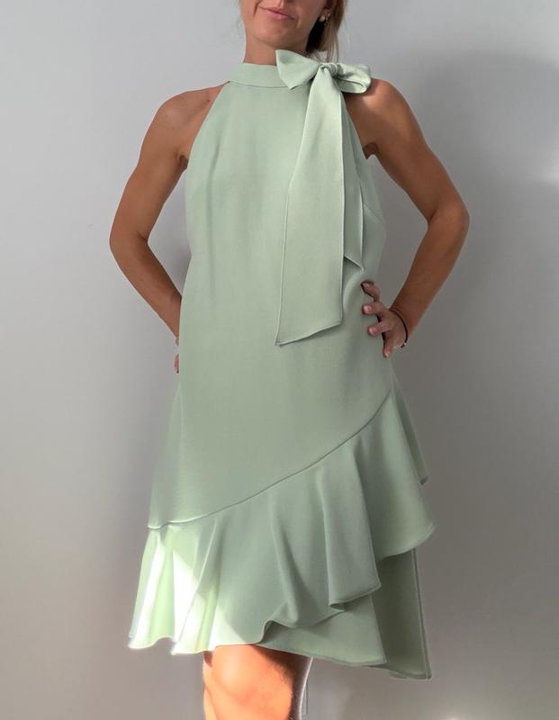 This sleeveless sage-green mini dress feels special and it’s suitable for a daytime event as well as for an evening out. The halter neckline ties into a pretty bow at the shoulder, adding a romantic detail. It’s made from a lightweight fabric, it drapes beautifully over the body and finishes with a gently ruffled asymmetrical hem. Sadly it’s all polyester but at the same time it doesn’t crease that means you can pack it with you when traveling and you won’t have to iron it.