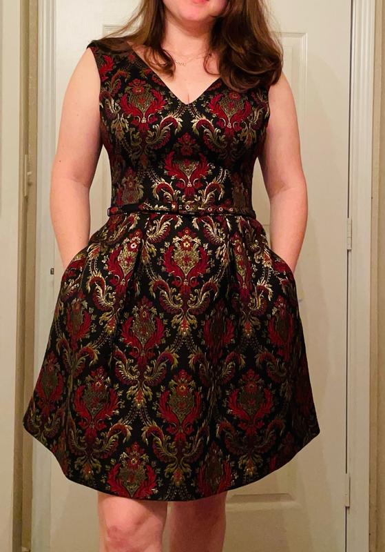 This feels like is a nice office holiday dress. The gold threading catches nicely in the light without being too gaudy but the cut and belt definitely gives office style. The material does snag very easily though but it has pockets! I could see this with a sweater and boot for the workplace during this season.