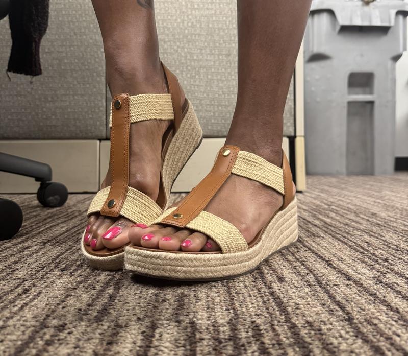 The soles are very stiff and no way to adjust the heel strap so they flopped around on my heel with every step. I liked the way they looked but so uncomfortable while walking. I have wedges from other brands that fit my foot much better