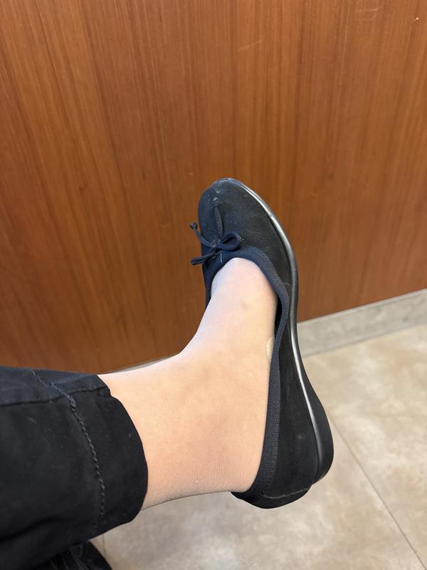 this style is not particularly flattering. it seems to make my feet appear larger than they are. they are as comfortable as most closed toe shoes can be on my bad feet. the color is good and reminds me of ballet shoes from my childhood.