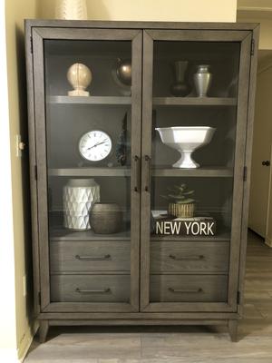 I love this display cabinet! The gray washed finish is beautiful! The simple design is classic and modern! The glass doors allows you to display beautiful pieces!!