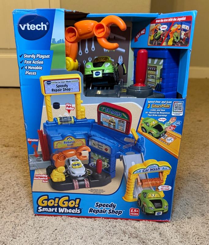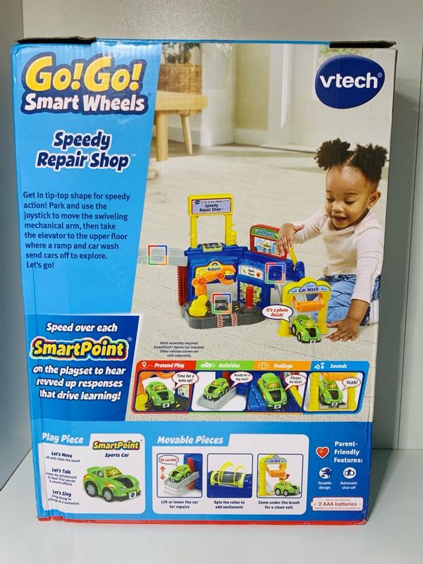 VTech Go! Go! Smart Wheels Speedy Repair Shop is a high-quality, durable toy. My barely-four-year-old loves cars and this garage toy keeps him happy and entertained for long periods of time. Directions for assembly are pretty straightforward. It took a little while to put together but it wasn't too difficult. The little car is very cute and easily responds to the codes on the track. The car does not have to be exactly in a certain spot to activate, as long as it's over the code it will work. It is nice to have a little bit of a margin for little ones who cannot always get items placed with exactness. The voice and sound effects are loud and clear. There is enough details to keep this toy entertaining for quite a while.