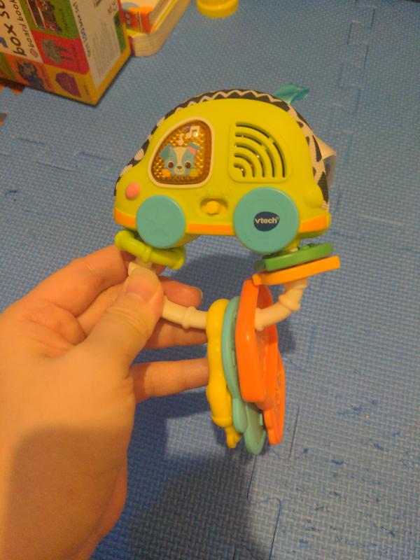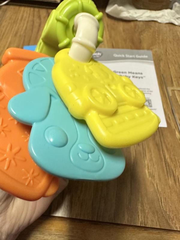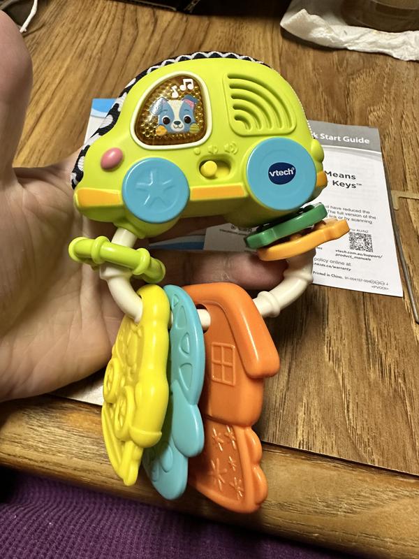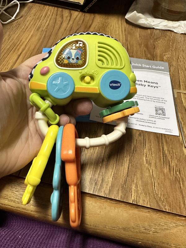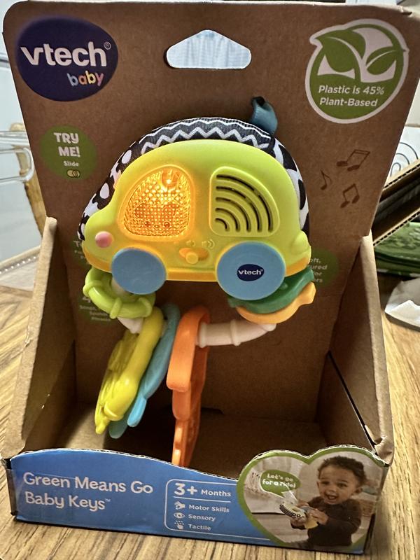 Got the Green means go baby keys by VTech, and my little one had fun with them. Nice size for her little hands, and it's perfect to keep her busy. Makes noise, and she can easily carry it around, especially when we "GO"!