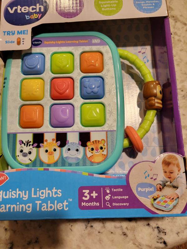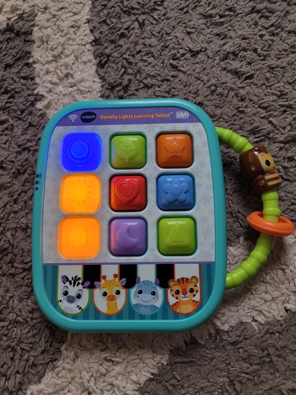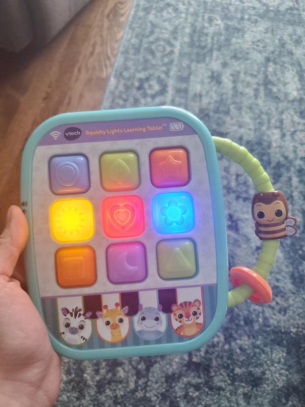 VTech Squishy Lights Learning Tablet is a fun and entertaining toy for babies. I really like that tablet design is compatible with age of babies. The buttons on the tablet are made of soft and squishy material and therefore, gentle and easy for child's hand to press them. The handle of tablet is durable and easy to grasp. I love that not only this tablet is entertaining but also has good learning information for babies like colors, shapes, animal sounds etc. When buttons are pressed, they light up with sounds, which is fun to observe and play with. Its a nice toy for little ones.