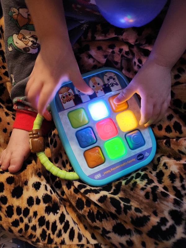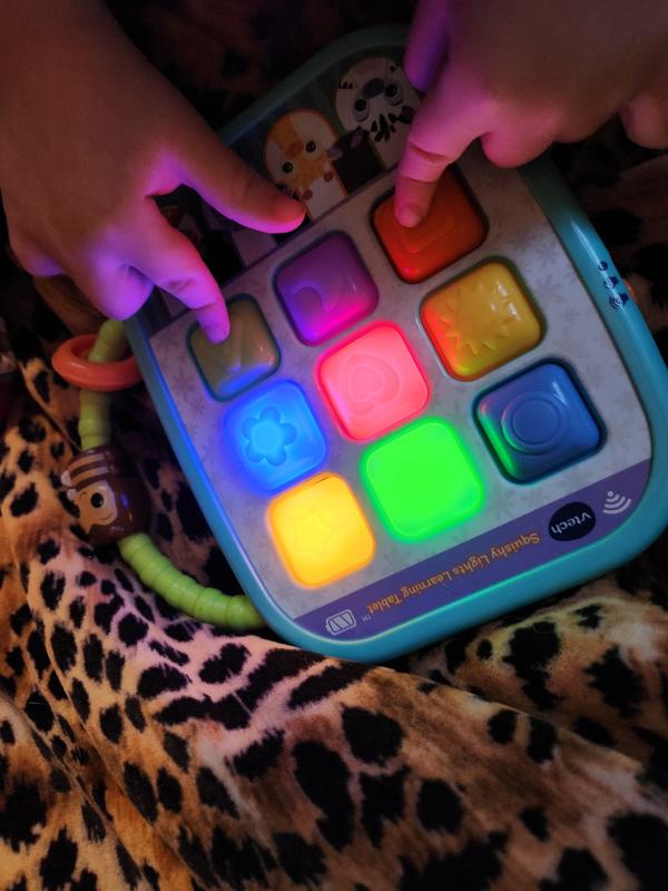 I absolutely love this new VTEC baby Squishy lights Learning Tablet. It teaches colors, shapes, sing-along songs, and says the names of animals, and the buttons are squishy and easy to push. My daughter absolutely loves this and she plays with it for hours at a time.