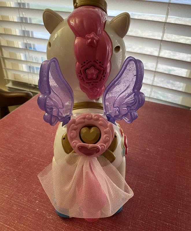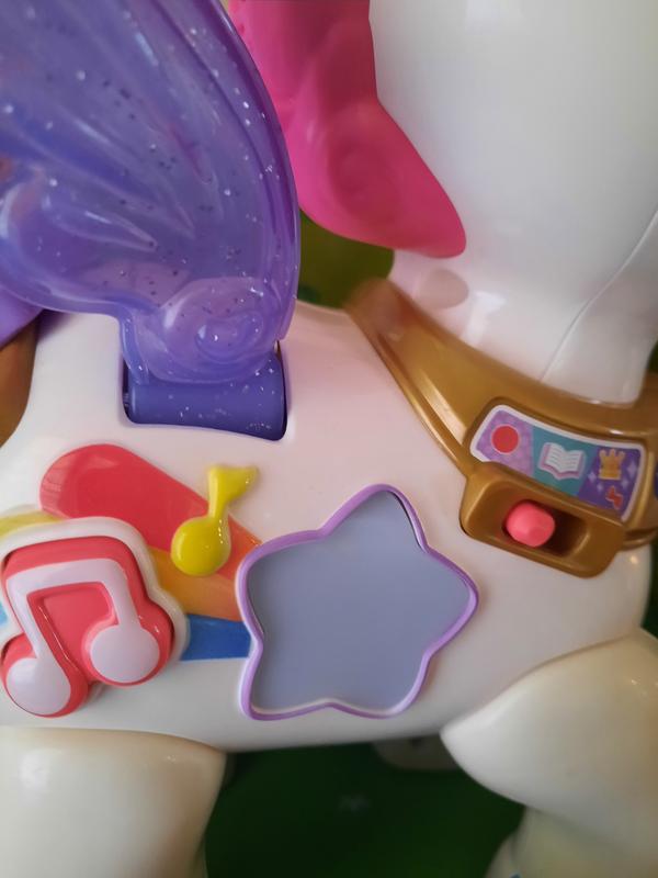 Absolutely love this it was so cute it has little extra pieces to go with it she is in love with people with unicorns and this was just perfect. Gee her loves how it glows up and it does the music and it's overall just very cute and anything VTech we love so this was perfect and she just had so much fun with this.