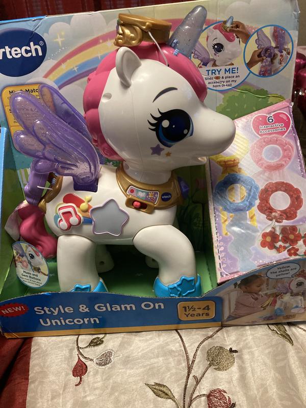 This VTech Style & Glam On Unicorn is an adorable interactive addition to play time for the kids. The unicorn has multiple ways to learn and interact with to learn about colors, counting and many other phrases. Comes with 6 different charms and accessories that you can connect to the unicorns head or body that will give different interactions. You can also push the stars on the sides for more songs or play with the wings as well for play time imagination. Over all a cute way to learn and play all in one