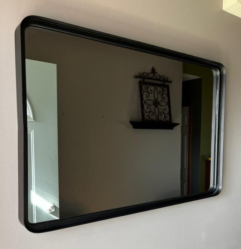 This mirror is great quality. Heavy and substantial with a nice depth to it from the frame to the actual mirror. I plan on replacing our current mirror in our kids bath with this. The color is nice and can go well with black or even silver hardware.