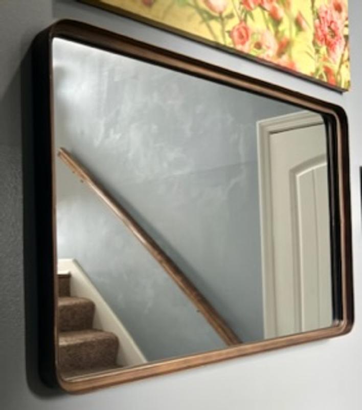 This mirror is absolutely beautiful and high high quality! It is so so heavvy- it was hard to hold it up to test different locations/positions. I was worried that the hardware would not be strong enough to hold this to the wall- but it is extremely sturdy and very easy to install. If you choose to lean this mirror without hanging- secure it so it will not fall over. I love the rounded edges and I love that it can be hung vertically or horizontally for an entirely different look! The metal surround is really high quality and does not seem like it will ever bend or discolor. The brushed bronze provides just the right amount of pizazz without being too shiny. It really works well for most aesthetics and is a beautiful addition to our mid-century modern design! Beautiful piece for any room in your house! Love it!