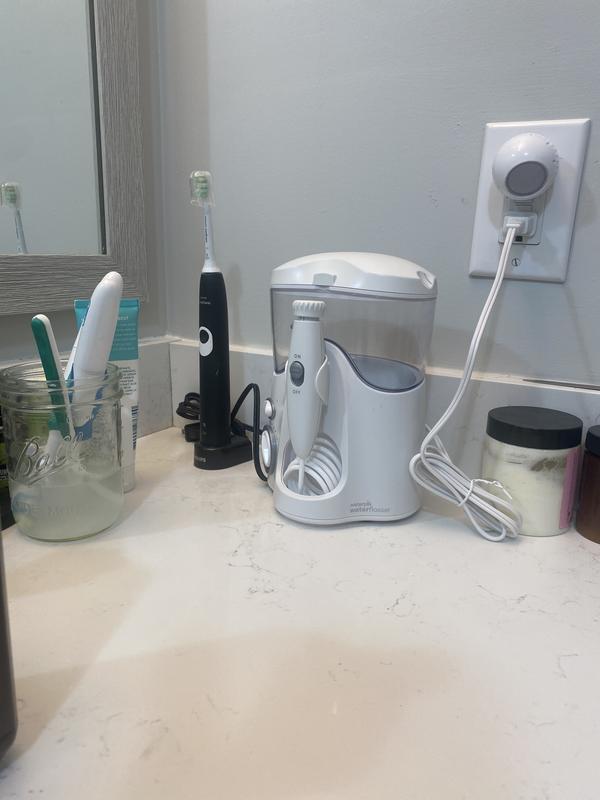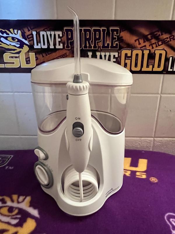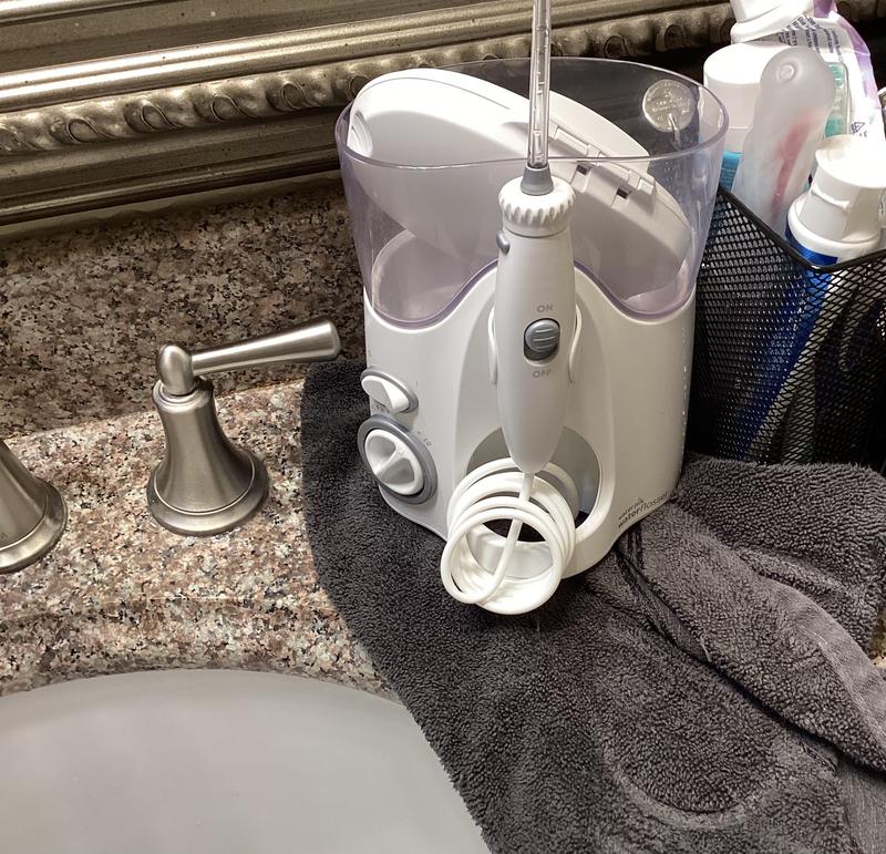 My old Waterpik was great for my teeth. Interestingly the wand had a button to shut the water flow off, I sprayed every wall and mirror in the bath room. I had a stroke and only one hand works. So I needed a new Waterpik. The new Waterpik has a button to turn on the water flow.