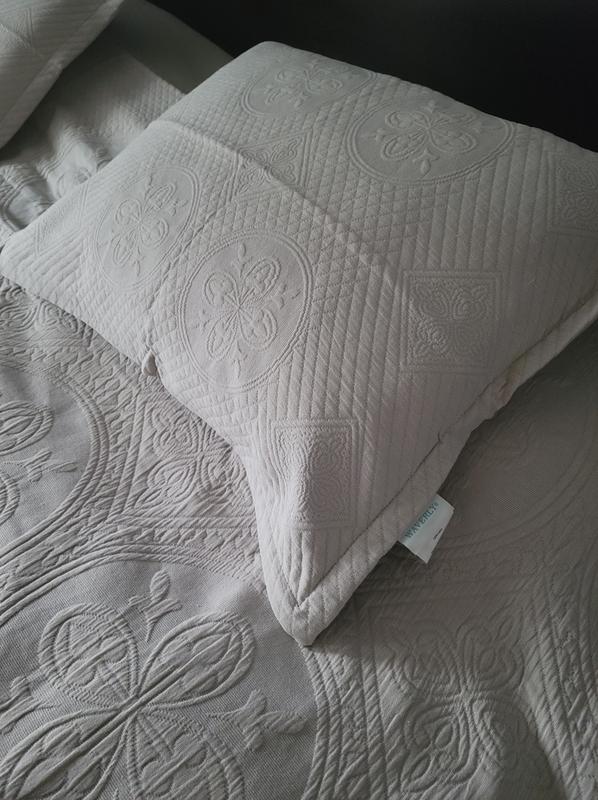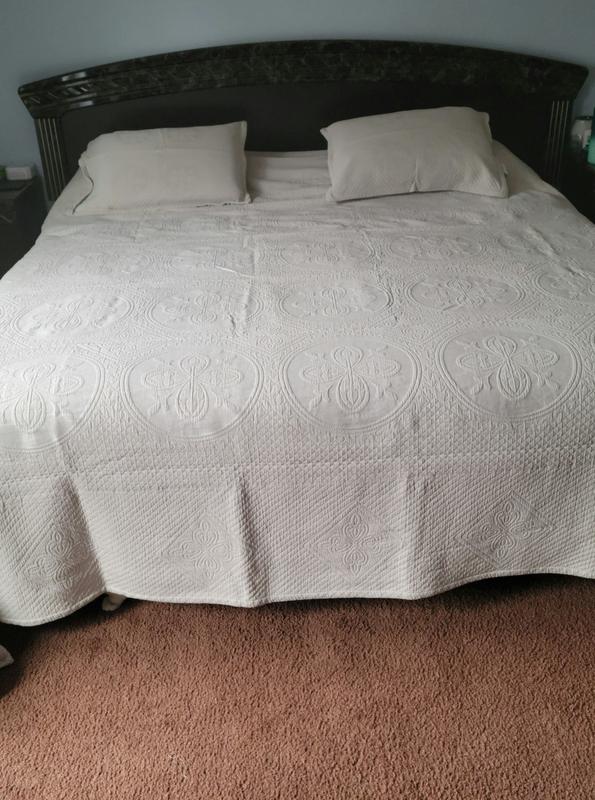 I am very happy with my new bedspread. Although I have a King sized mattress this Queen oversized bedspread fits perfectly! It is made of excellent quality and I couldn't wait to put it on my bed. The cream/tan color fits my bedroom decor/colors quite nicely. The pattern to the shams and bedspread are very pretty and make it that more special. I love that the shams have a zipper on them keeping the pillow inside. The shams fit my pillows perfectly. The set is easy to wash and washing did not change the quality of it. It is on the heavier side but not heavy enough that I would not use it during warmer months. I am very happy with this set and love having it on my bed.