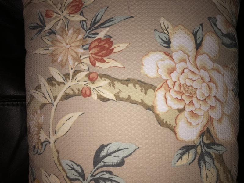 I bought theWaverly Mudan pillow last week. I'm happy because it's true to the picture. It's looks so delicate and pretty, yet it's a strong sew and holds well. It really softens up the room and furniture that it is placed on.