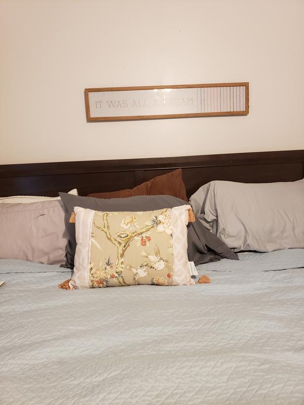 I got this Wavery brand pillow last month. It matches my sheets perfectly in my bedroom. It's the perfect size to go on my bed to add a easy accent. The only issue I had was the tassels came off easily.