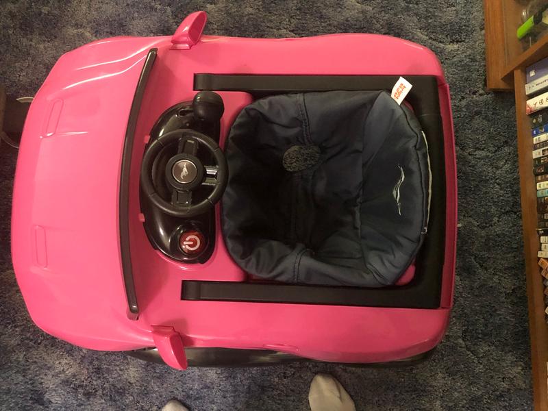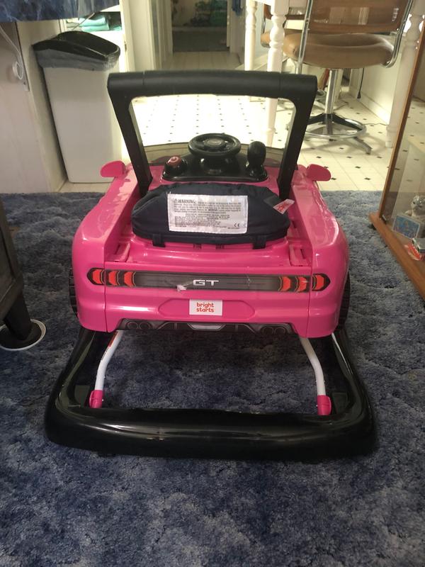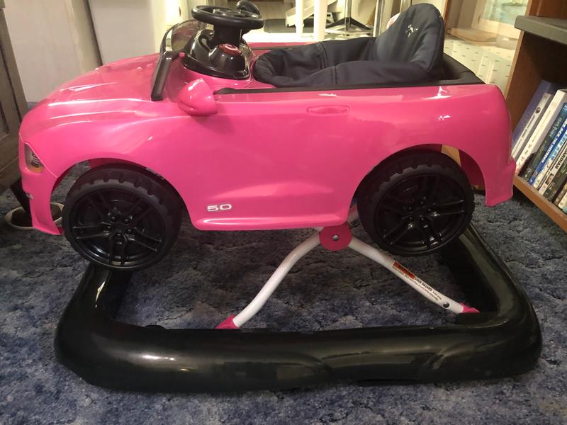 This Bright Starts Pink Ford Mustang 3 Ways to Play Walker, comes with easy to read and follow instructions, taking us under 15 minutes to completely assemble. Love knowing that when my child outgrows using it as a sit down walker, that it easily converts into a push behind walker. The car body is cutely designed from molded plastic, that includes molded in non working side mirrors, headlights, rear tail lights, heavy duty plastic tires and has the Mustang Pony emblem on the front grill. My seven month old fits into the high back fabric covered seat nicely, which can also be removed to be machine washed and low dryer setting dried. There are three different height adjustments, the lever can be accessed by tilting the walker over. The wheels move easy on both our tile and hardwood floors, but not all that great on carpet. The steering wheel play station can be removed from the car for floor time play. It has a gear shifter, working horn, starter button, mimics car sounds. It requires 3 AA batteries (not included). Its very sturdy and best of all it folds down for easy storage and travel.