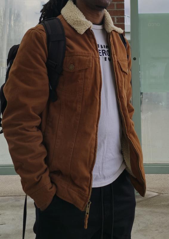 Bought this as a Christmas gift for my fiancé so I can’t really comment on the fit or warmth at this point. It is deep grey in color, Sherpa lining feels cozy and is a light beige. The jacket seems to have substantial weight for warmth. I hope he likes it, because I do.