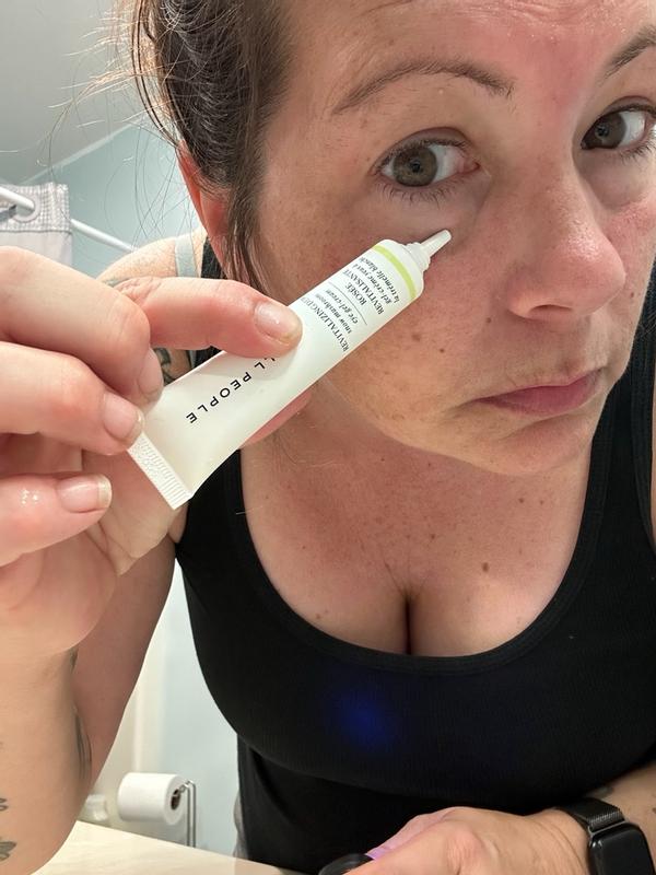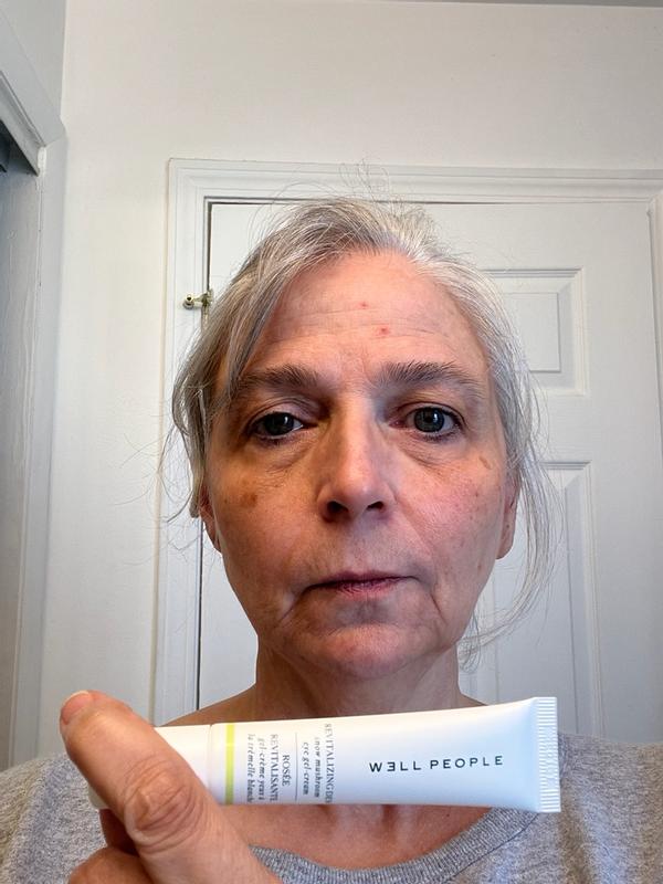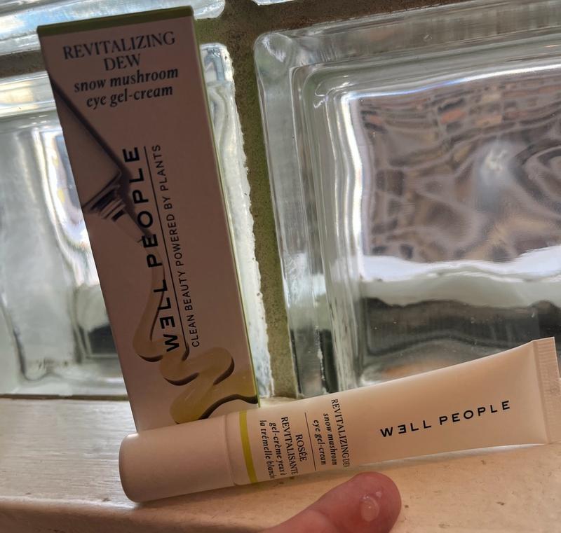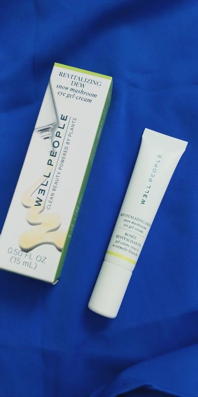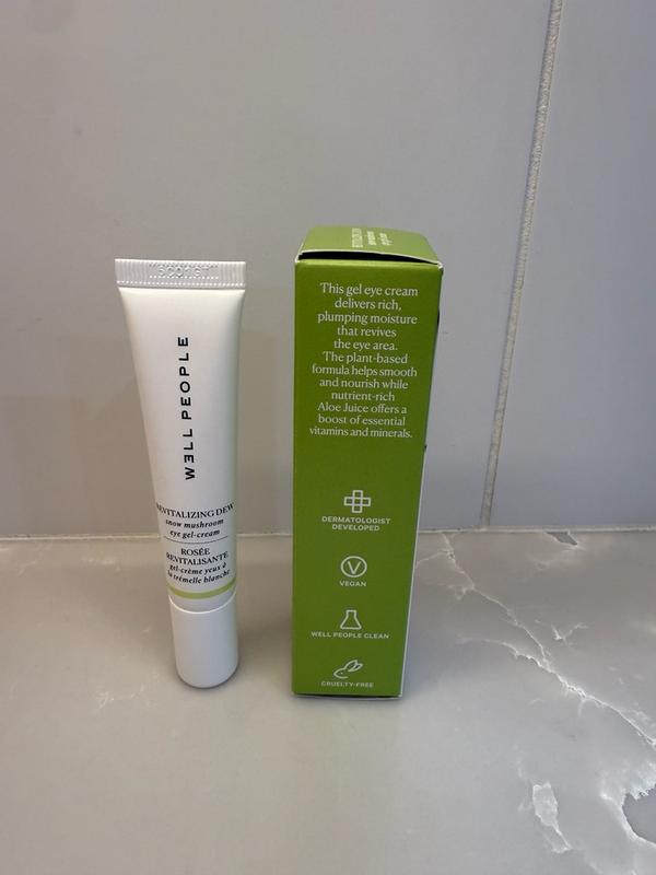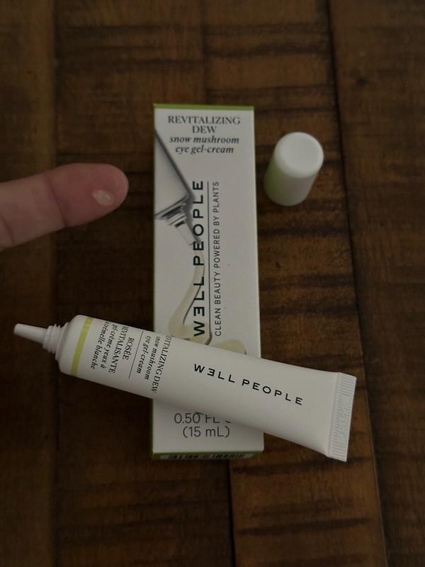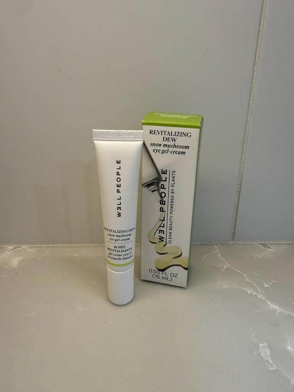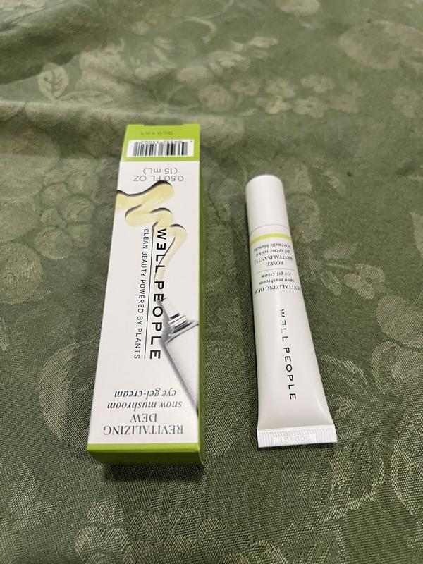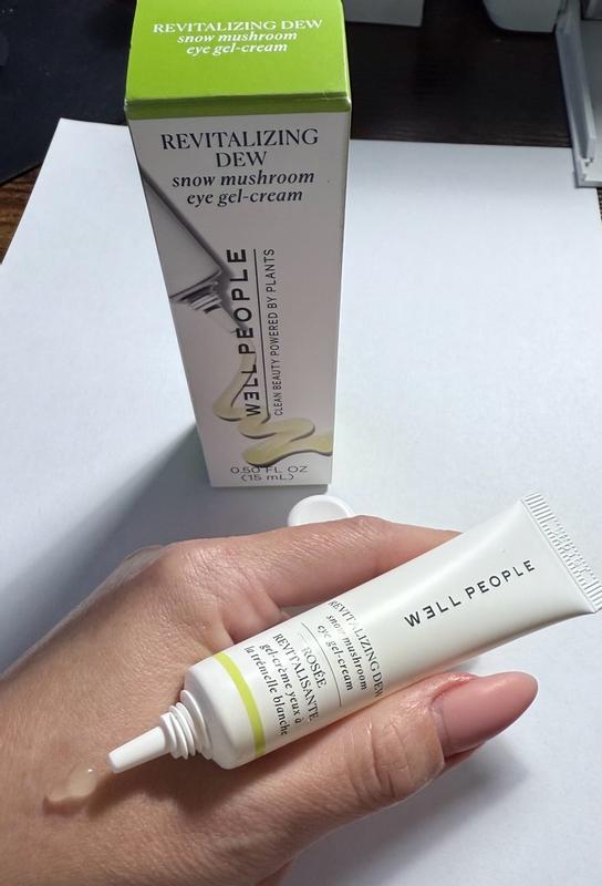 Perfect for those who want a clean, plant-based eye cream that focuses on hydration and freshness rather than intense anti-aging results. Hydrating yet lightweight Great for sensitive skin Clean, vegan, cruelty-free formula Refreshing, soothing feel on application The product comes in a slender rectangular outer box with a white front face and a lime-green edge/side accent; the front features the tube “squeezing” image of the product, the brand name “WELL PEOPLE” in bold, and the product name “REVITALIZING DEW SNOW MUSHROOM EYE GEL-CREAM”.