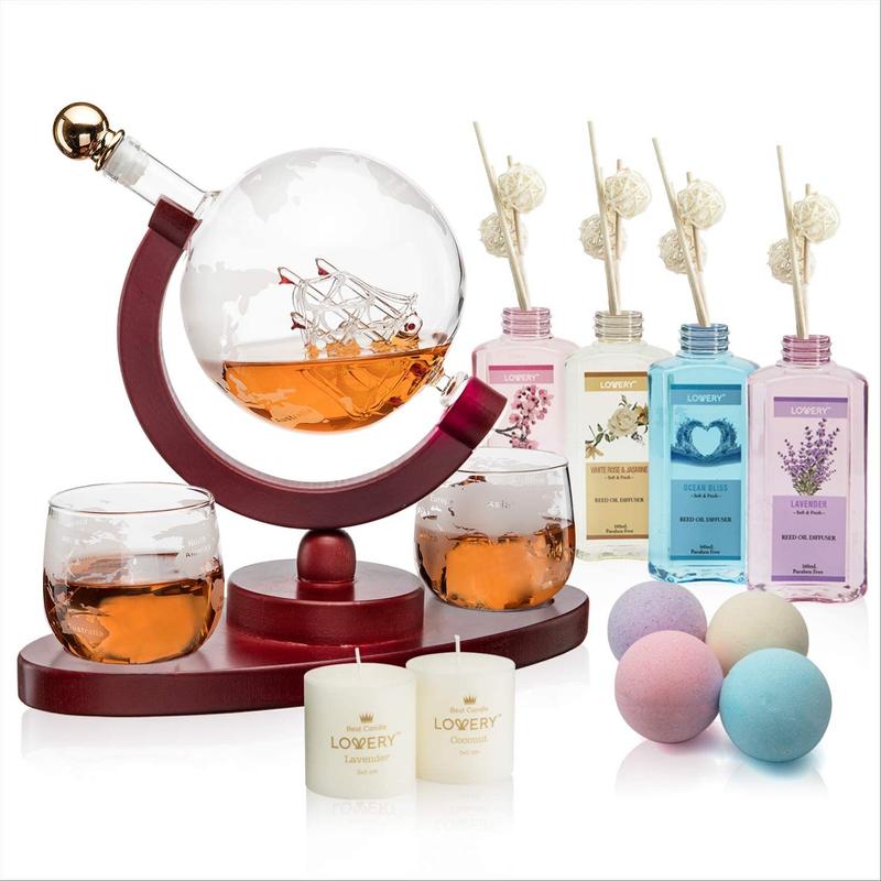 Whiskey-Wine Globe 16 Piece Gift Set is one of a kind! I love it! It comes with bath bombs, candles, a beautiful decanter and wine glasses and four oil diffusers Everybody that has come to my home has complimented me on it.Tgis gets five stars plus. I'd absolutely recommend this to all my friends and family and anyone who appreciates nice things.