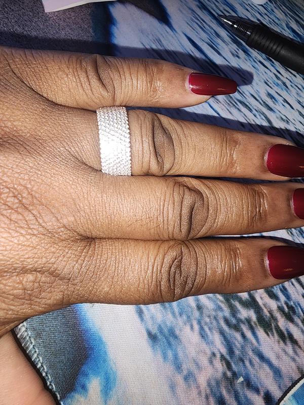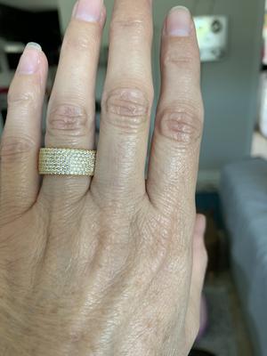 I absolutely love this ring! It is dramatic with the black background and eye catching with the sparkle of the cubics. Very good value for the money. I will wear it and enjoy it often and for a long tine. The sales rep, Norma Kulsuk, was so helpful and made the shopping experience even more fun and easy.
