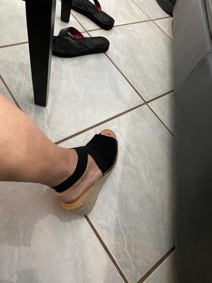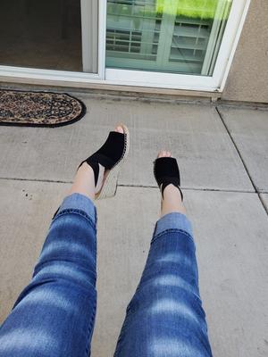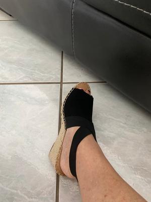 Love this shoe, I purchased blue and black, very comfortable fit, Enough heel to elevate your height but not so high that your calf muscle is predominant and tight with each step. The strap around the ankle is comfortable. I also bought my 20 year old daughter a black pair and she loves hers.