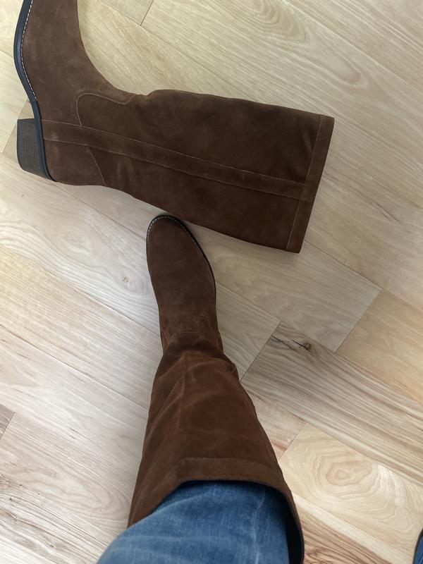 These boots fit perfectly for me. The suede is very nice a lot of boots don’t have this really nice suede nowadays. I’m very happy with my purchase. They are pretty comfortable too. 🙂 I would’ve preferred black stitching.