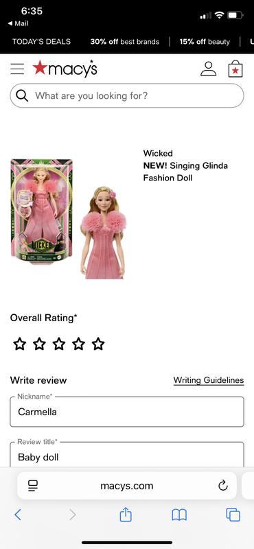 This doll was a huge hit with my daughter who loves the Wicked movie. She is a great reproduction of the on screen Glinda from the face to the clothing. Her outfit and accessories had a lot of small special touches that made the doll look very pretty and feel special. The song she sings has played many times in our house, we love it! My daughter has loved playing with her, and started saving for a matching Elphaba doll right away.