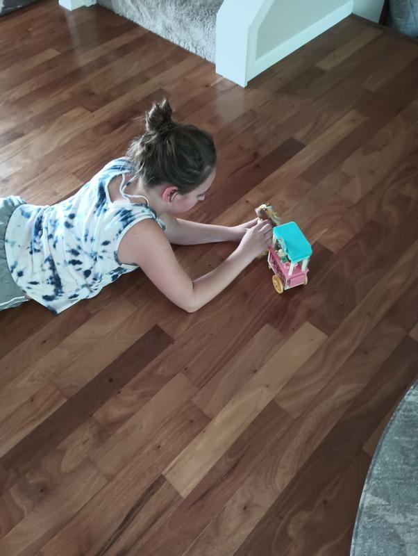 This was a cute little play set for my daughters. It does have smaller pieces, so be aware for smaller children. My daughters had fun pretending to sell the little food that came with the set, and of course playing with the pony. It’s very colorful and fun the dress up the pony. The only complaint was that the pony did not stand up easily on its own, due to being in a trotting pose, even though the legs do move. The back legs are fixed in the pose but move like a Barbie leg. Overall my girls had fun with it.
