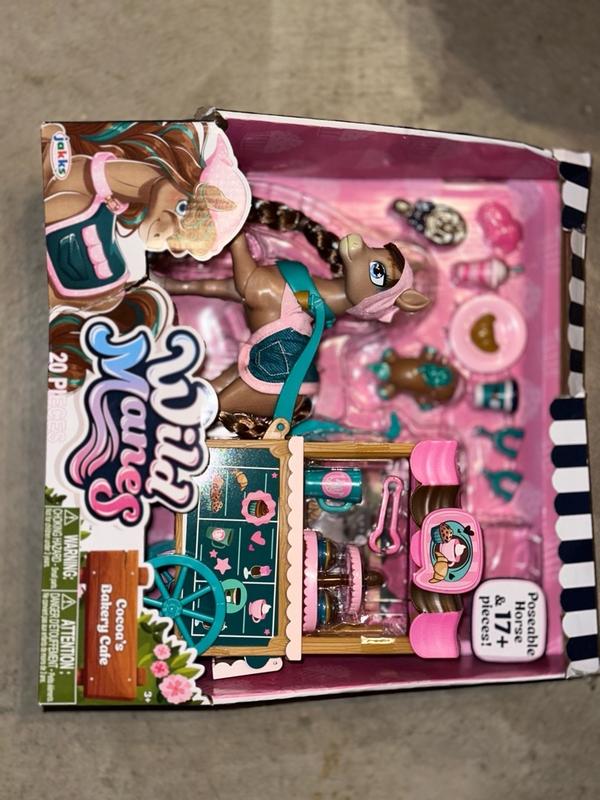 The Wild Manes Cocoa's Bakery Cafe toy is one of the cutest sets I have ever seen. Cocoa is a beautiful horse that has a ton of accessories and also has a Bakery Cafe. I love when sets come with all of the little accessories because it keeps my daughters attention for hours. She can also use the Bakery with her other toys. The horse is poseable, and the cafe is really well made. This a great addition to our collection.