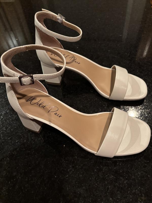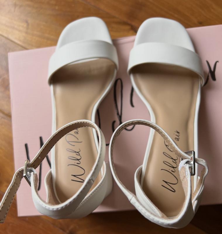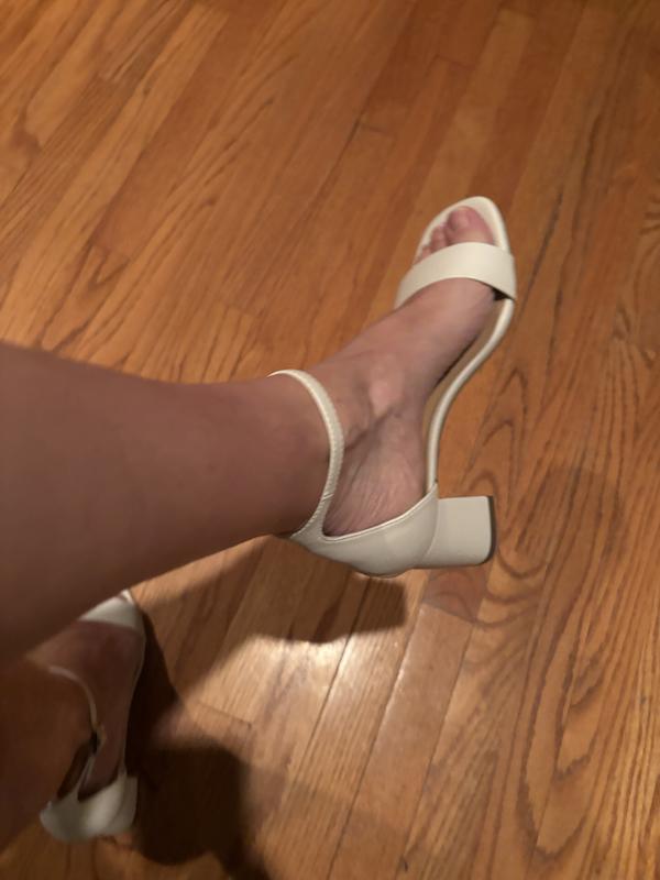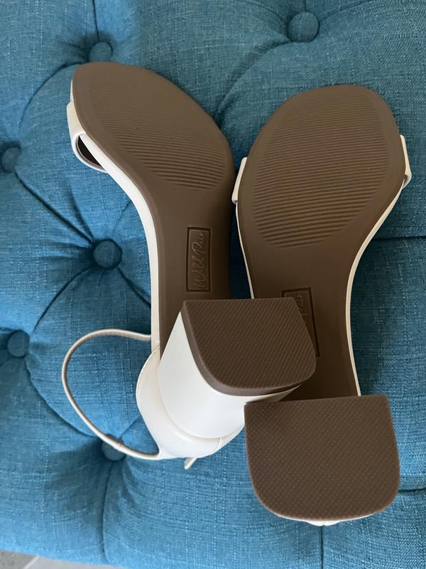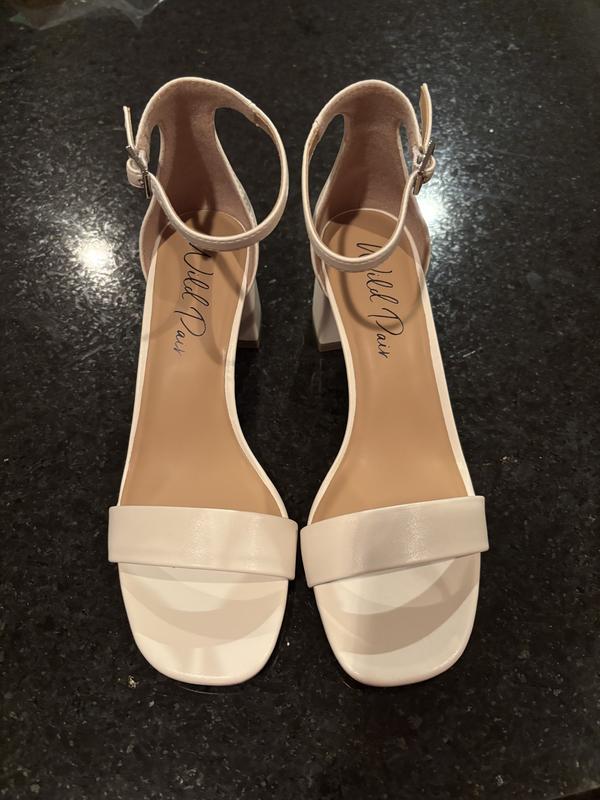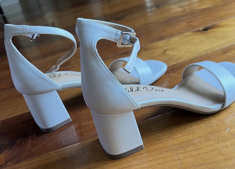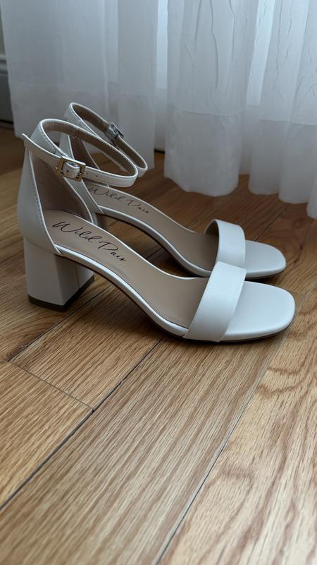 Classic white line sandal with low block heel. The color is more off white rather than bright white. The sandal is comfortable due to the lower heel. I normally wear an 8.5 but the 8 fits fine since half sizes were not available. This is a great shoe style for a wedding or prom; dressy yet easy to walk in these sandals.