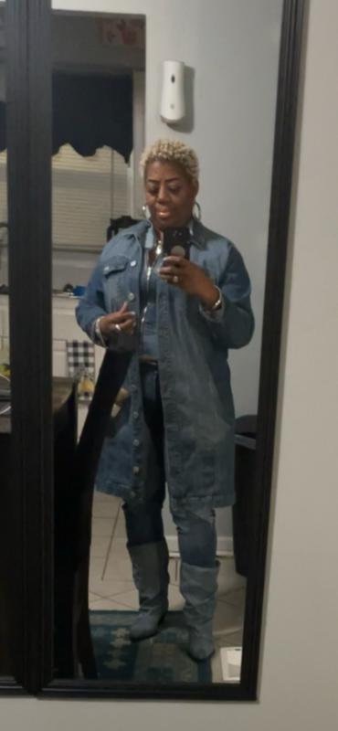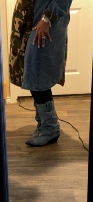 I have been looking for denim boots. These boots are super comfortable and there were so many different ways to pair them. I chose a graphic T blazer and some leather leggings.