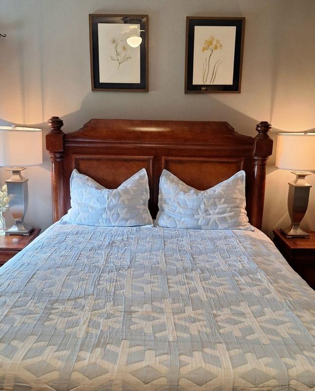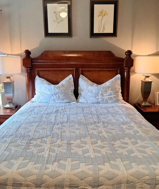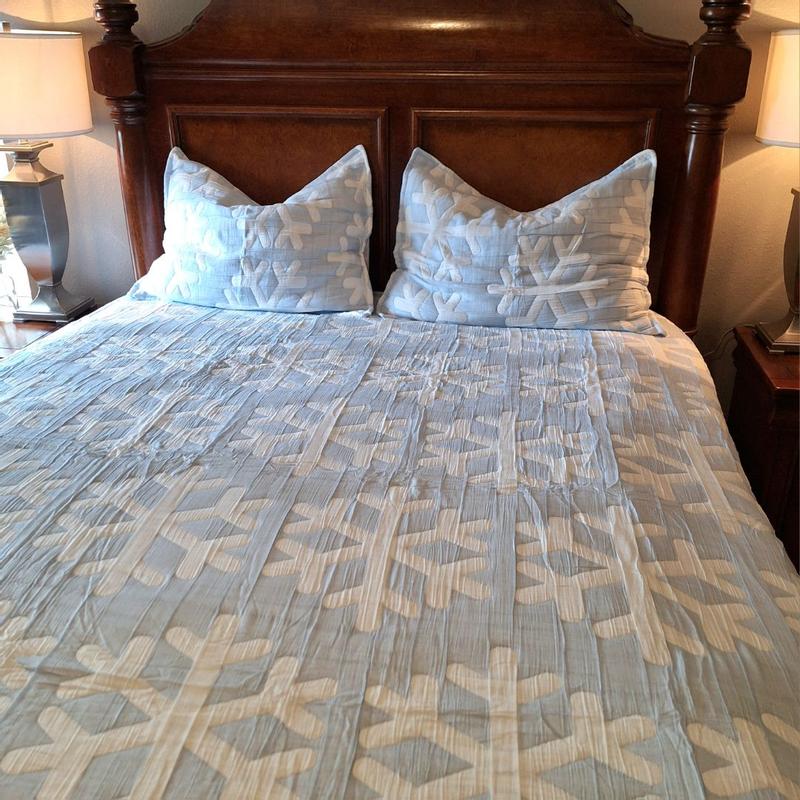 I love the color of this quilt and it's a great look for the winter months. The light/ice blue is so pretty. The quilt and shams are in great shape and went on the bed easily and wrinkles fell out quickly. I really like this set all around. Thank you to Influenster for the opportunity to try this product in exchange for my review.