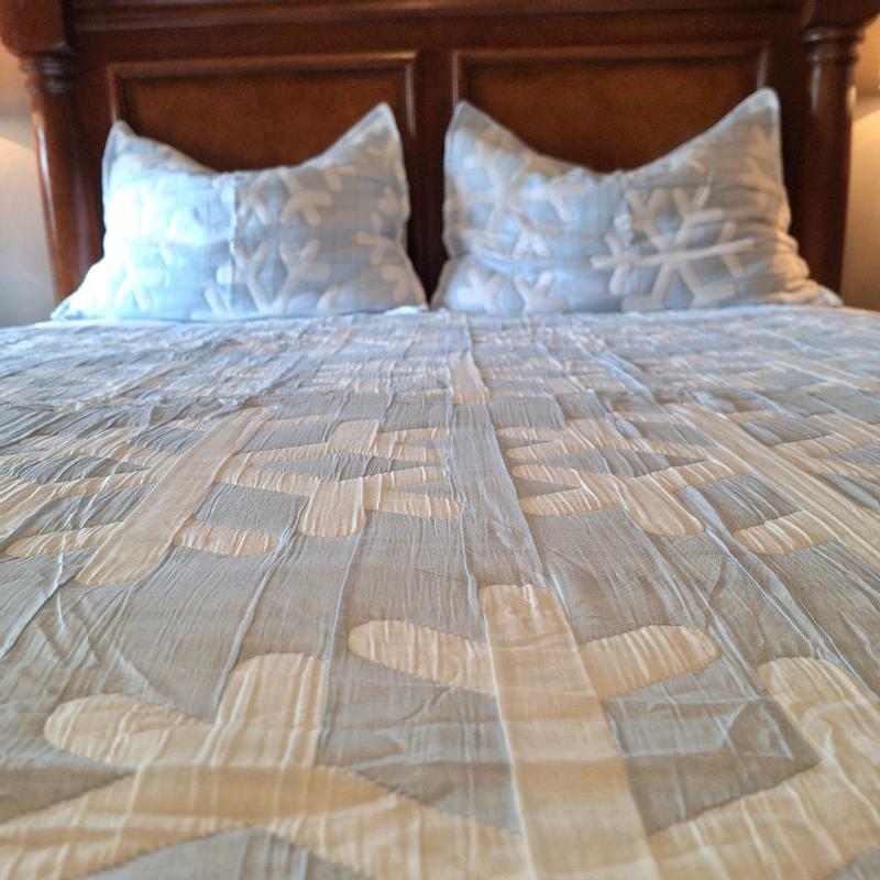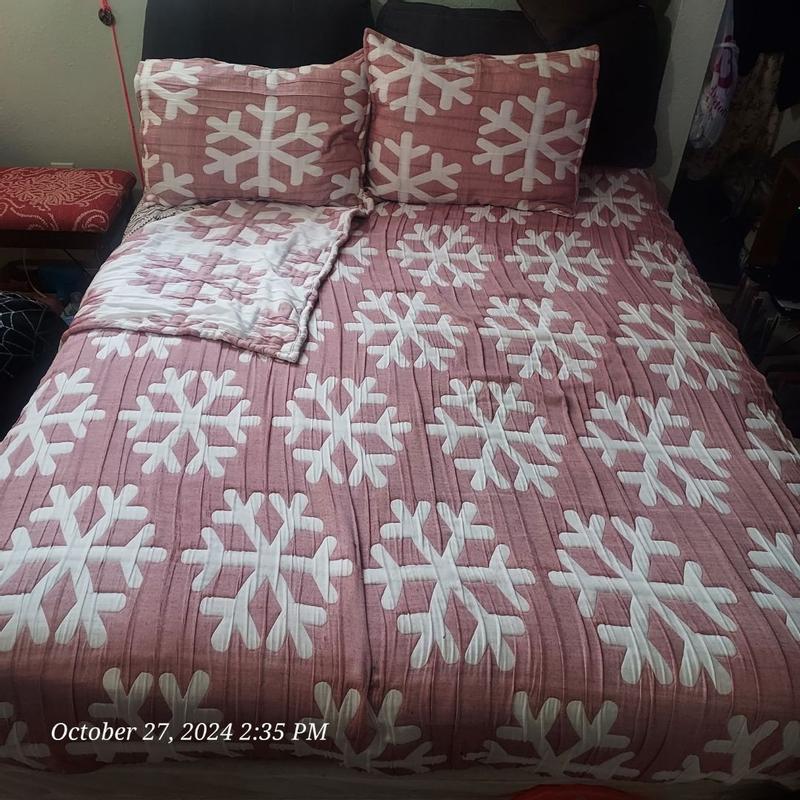 I received the BH Collective Nino Matelasse Quilt Set in the light blue and white snowflake pattern, and it’s absolutely perfect for the holiday season! The design is festive and elegant, bringing a cozy winter vibe to my bedroom. The package was compact, but I did receive the full queen set as expected. The cotton material feels soft and comfortable, making it a joy to use. The only downside is that the set doesn’t include a cover sheet, which would have made it even better. Overall, though, I’m very happy with the quality and style—it’s a great seasonal addition!
