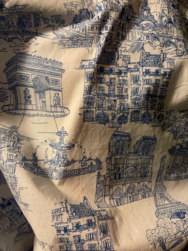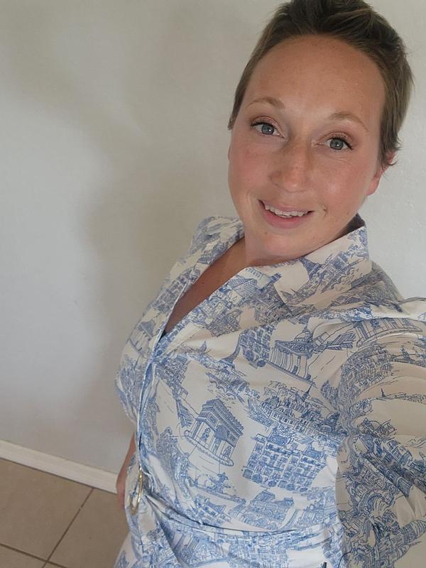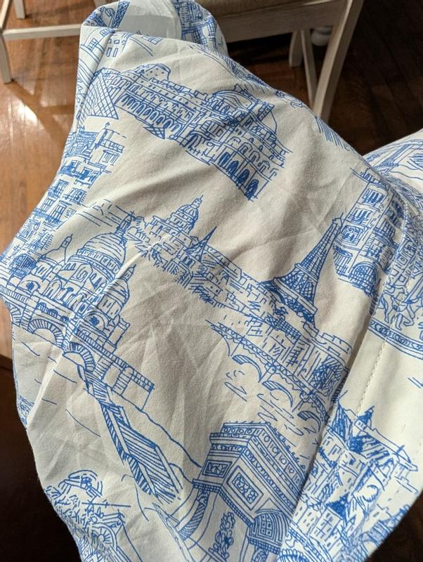 I really like this dress. The cut and length of sleeves are perfect for me. I like the toile design. The material is cotton and is not too hot for summer.