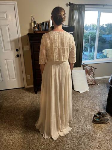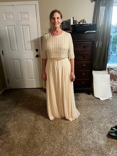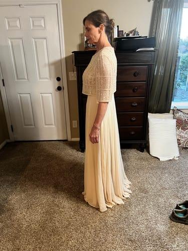 I will wear this for my wedding on April 20, 2024. I have looked everywhere for a stylish, beautiful dress for an older bride. Everyone agrees this dress is stunning. And it is very comfortable as well. I will be able to dance into the evening.