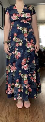 I think this dress is beautiful and very flattering. The print and colors are very pretty. I am only giving it 4 stars because it needs to be about 2-3 inches longer for the people 5'7 and taller. I am 5'6 and a half. My preference is to have full length dresses almost hit the floor especially if I wear heels.
